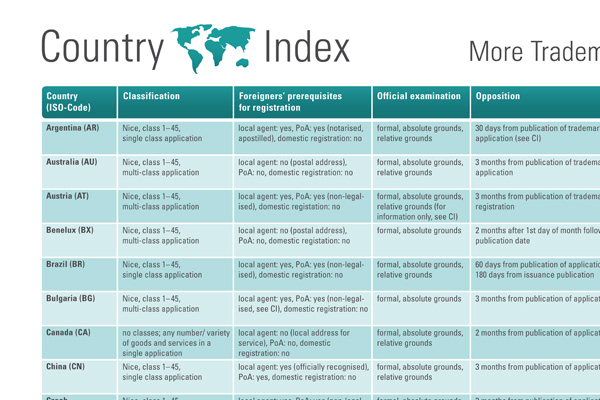 SMD Country Index poster provides a useful overview with brief information on trademark regulations in over 40 countries. The summary table contains